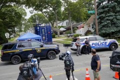 Investigators, some dressed in “crime lab” T-shirts and protective suits, were seen Tuesday carting away a desktop computer, a large picture frame, a mirror and many other household items.