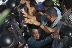 As the crowd swelled, amid shoves, Mexican officials allowed several dozen migrants to enter the country in groups of 20, while a voice over a loudspeaker warned migrants against trying to slip into Mexico without passing through immigration filters.
