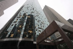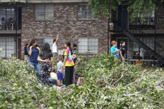 The widespread destruction brought much of Houston to a standstill. Trees, debris and shattered glass littered the streets. One building's wall was ripped off.