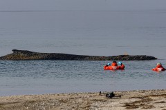 Rescuers initially managed to turn the whale so its head was pointing toward deeper water, hoping it could find its own way back there, but the animal then turned back to its previous position. Boats from the coast guard and the fire department passed by, creating large waves in the hope of freeing the animal — but also without success, German public broadcaster NDR reported.