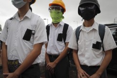 High school students added gas masks, goggles and hard hats to their traditional uniforms, while university pupils crowded into a square at the Chinese University of Hong Kong. Workers also participated in their own rally at a public park, braving strong winds and storm clouds as a typhoon threatened.
