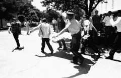 Along the streets bordering the campus people scurried into alleys and hid behind autos and buildings. Police sealed off traffic for blocks as they mounted their siege. Radio stations blared warnings.