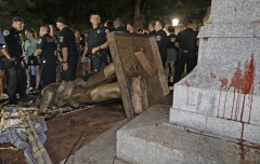 WRAL-TV reports that more than 300 people gathered at the Peace and Justice Plaza at about 7:30 on Monday evening before marching to the Confederate statue's base and calling for its removal. At 9 p.m., protesters had marched down Franklin Street before returning back to the statue's base. By 9:30 "Silent Sam" was down.