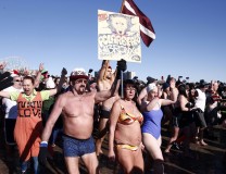 While some dressed in dinosaur or penguin outfits, others wore nothing but underwear or bathing suits at the annual Coney Island New Year's Day Polar Plunge, a New York tradition since 1903.