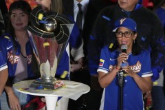 Venezuela's acting President Delcy Rodriguez, right, speaks next to the World Baseball Classic trophy a day after her team's victory over the United States in the championship match, at Miraflores presidential palace in Caracas, Venezuela, Wednesday, March 18, 2026. (AP Photo/Ariana Cubillos)   (Associated Press)
