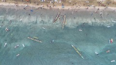 The “paddle out” gathering is a ritual observed in Hawaii in honor of loved ones. So many spectators packed a beach park to watch the surfers that there was little room to move. People blew conch shells both from shore and the water as others dropped flower petals in the ocean.