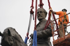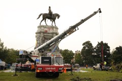 The state brought in a deconstruction crew surrounded by a heavy police presence to strap the statue to a crane. State, capitol and city police officers closed streets for blocks around the state-owned traffic circle in Richmond, using heavy equipment and crowd-control barriers to keep crowds away. The Federal Aviation Administration granted the state’s request to ban drone flights during the event, which will be livestreamed through the governor’s Facebook and Twitter accounts.
