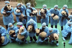 Giant pandas are China's unofficial national mascot and live mainly in the Sichuan mountains, with some in neighboring Gansu and Shaanxi provinces. An estimated 1,864 live in the wild, where they are threatened chiefly by habitat loss. Another 300 live in captivity.