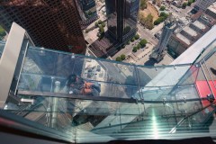Perched 1,000 feet above the ground on the side of the tallest skyscraper west of the Mississippi, the 360-degree glass slide is utterly terrifying. It's is nearly a straight shot down, except for a small turn at the beginning that causes riders to bump against the side of the glass, much to their horror.