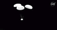 Recovery teams cheered as they watched the capsule drift down through the air and make a bull's- eye landing. The touchdown was broadcast live on NASA TV; infrared cameras painted the descending capsule in a ghostly white.