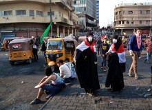 Four people were shot by security forces on the bridge the previous day. Protesters are also occupying parts of the nearby bridges Jumhuriya and Sinar — all of which lead to the fortified Green Zone, the seat of Iraq’s government.