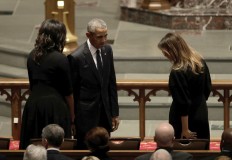 Seated near the front of the church, in the same pew, were two other former presidents — Bill Clinton and Barack Obama — along with their wives and current first lady Melania Trump.