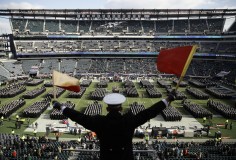 The commander in chief flew to Philadelphia for the 119th meeting in the storied rivalry between the service academies, and officiated the coin toss at Lincoln Financial Field, home of the Super Bowl champion Philadelphia Eagles. Navy called "tails," and that's what it was when Trump's flipped coin landed on the turf. Navy elected to kick off.