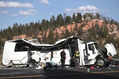Utah Highway Patrol officials previously said it appeared the driver swerved and overcorrected, sending the bus rolling over into a guardrail near a highway rest stop a few miles from the national park. The crash left the top of a white bus smashed in and one side peeling away as the vehicle came to rest mostly off the side of the road against a sign for restrooms.