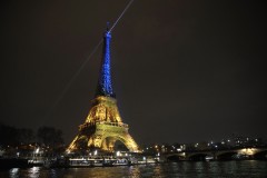 Tributes to Ukraine’s resilience flowed from overseas. The Eiffel Tower in Paris was among monuments illuminated in Ukraine's colors — yellow and blue.