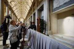 People filed past, many crossing themselves or snapping photos with their phones. Ushers urged them to keep moving to accommodate the thousands who flocked to the Rome basilica to see the tomb, forming a long line outside.