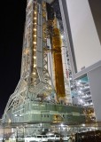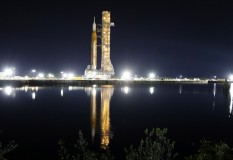 The 322-foot (98-meter) rocket emerged from its mammoth hangar late Tuesday night, drawing crowds of Kennedy Space Center workers, many of whom were not yet born when NASA sent astronauts to the moon a half-century ago. It took nearly 10 hours for the rocket to make the four-mile trip to the pad, pulling up at sunrise.
