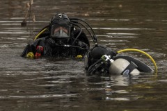NYPD officers in diving suits search a lake in Central Park, Monday, Dec. 9, 2024, in New York. (AP Photo/Yuki Iwamura)   (Associated Press)