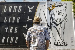 With a sweep of her brush, Corie Mattie has erected a memorial on the side of a building showing the beloved big cat wearing a crown with the words “Long Live the King.” Earlier this year, she painted a separate mural devoted to P-22, where residents left flowers after the cougar died.