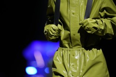 Outerwear and work clothes formed the backbone of the collection, sturdy, durable pieces. Statement pieces like long overcoats were trimmed in technical mohair, thick along the hem, and ringing the upper arms. At times, shoulders were accentuated, and a belt pulled tight at the waist for maximum form.
