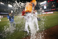 A giddy Scherzer smiled and yelped as he high-fived and hugged other Nationals players on the field. He was doused by his teammates during a postgame television interview.