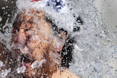 Taking turns, each ducked into the pool and poured water over their head, using a wooden bucket while shouting “Ei!” to pump themselves up as other participants and onlookers cheered.