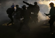 The riot was declared Tuesday night outside a county building, police said. They ordered people to leave the area. People were smashing windows on the first floor, and threw “burning material” inside, the Multnomah County Sheriff’s Office said.