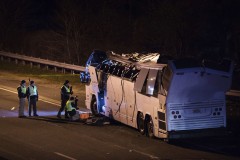 LAKEVIEW, N.Y. (AP) — A charter bus carrying teenagers returning from a spring break trip Sunday night struck a bridge overpass on Long Island, seriously injuring six passengers and mangling the entire length of the top of the bus.