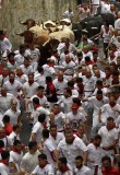 The pack dashed together along the cobblestoned, barricaded street course. Toward the end, one of the bulls stumbled briefly, causing panic and at least one goring when it resumed the race and charged at some of the racers.