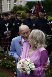 As the swing of Glenn Miller and other period tunes rang out on the streets, well-wishers — some in WWII-period clothes — were already lined up a good hour before the wedding, behind barriers outside the town hall, with a rousing pipe and drum band also on hand to serenade the happy couple.