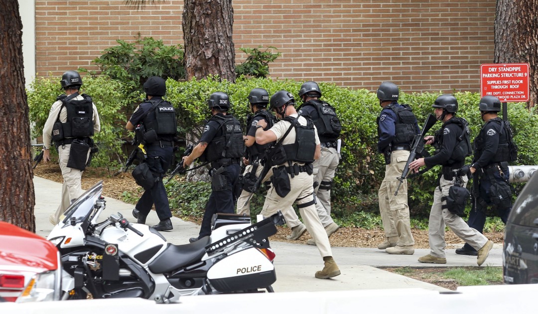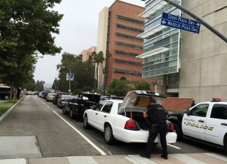 Many students posted to social media, many to let friends and family know they were safe. Some described frantic evacuation scenes and a large police response. Others wrote that their doors weren't locking and posted photos of items like photocopiers and foosball tables pushed up against them. At a mathematical sciences building near Boelter Hall, SWAT officers with guns drawn cleared occupants who emerged one by one. One man walked out with his hands up and was told to get on his knees. An armed officer searched him and his backpack, then sent him on his way with his hands still in the air. Bioengineering professor Denise Aberle said she could see "a lot of police activity with innumerable cars" and a police helicopter hovering over the engineering building. "Police keep coming," she said. (Read more school shooting stories.)